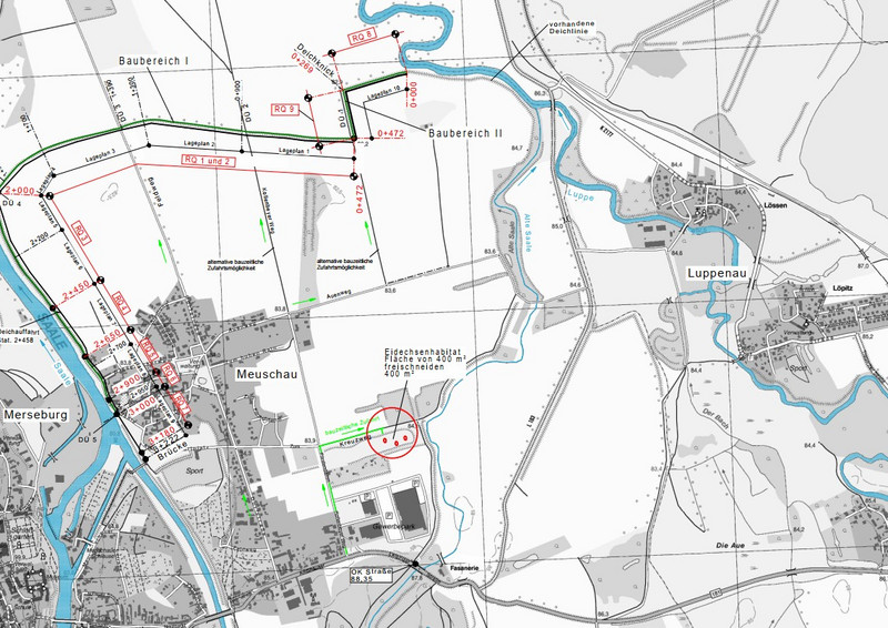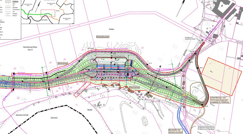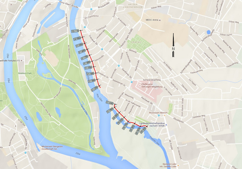 Deichsanierung des rechten Elbehauptdeiches auf ca. 1, 7 km Länge in der Ortslage Magdeburg-Cracau. Dazu erfolgt die Anpassung der Deichhöhe an das Bemessungshochwasser. Außerdem wird die Verbesserung der Standsicherheit angestrebt. Teil der Maßnahme sind außerdem umfangreiche Ausgleichs- und Ersatzmaßnahmen sowie der Biberschutz.